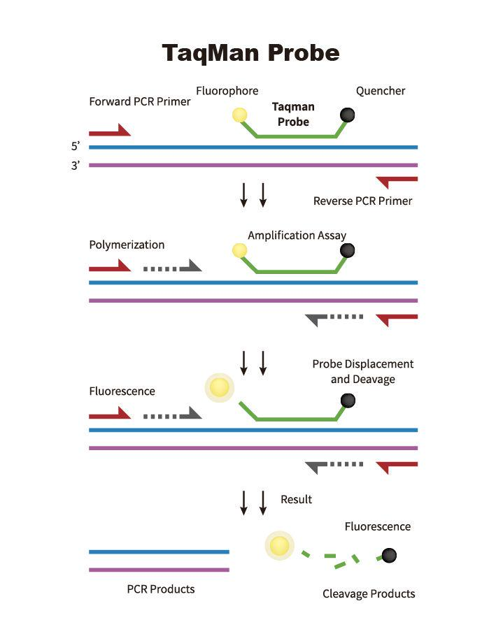 The TaqMan probe–based assay is a widely used genotyping method for single nucleotide polymorphism (SNP) detection. This technique uses allele-specific probes labeled with different fluorescent dyes, which bind to the target SNP region during PCR. When the correct probe hybridizes and is cleaved by Taq polymerase, a fluorescence signal is generated, indicating the specific allele present.